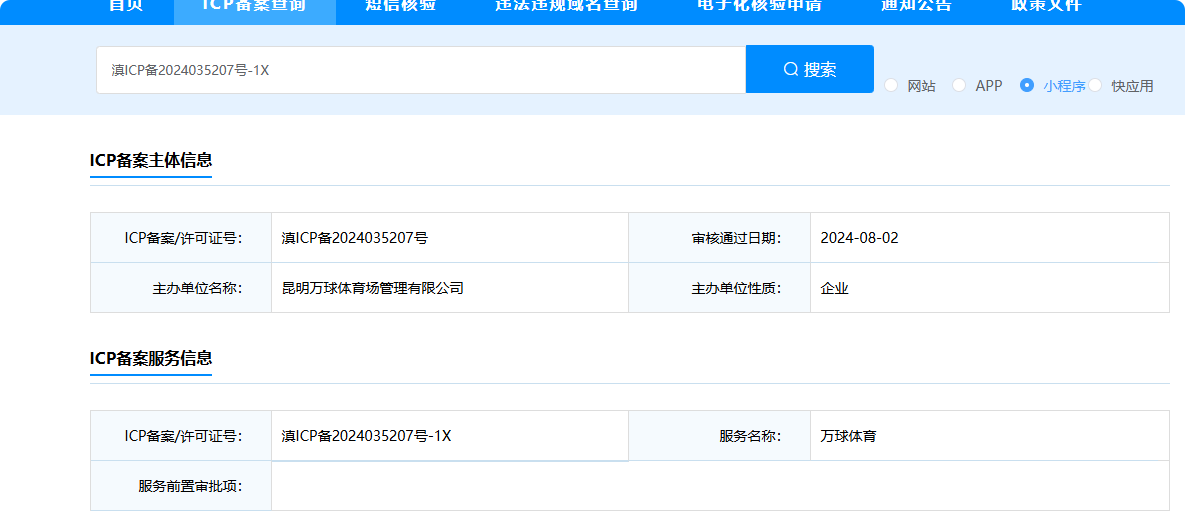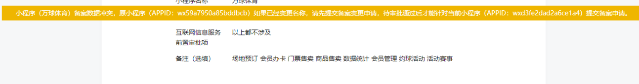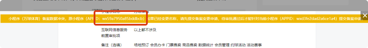 小程序 (万球体育)备家数据冲实,原小程序 (APPID:wx59a7950a85bdbkb)如果已经变更名称,清先提交备室变更申请,待审批过后才能针对当前小程序(APPID: wd3fe2dad2a6ce1a4)提交备案申请