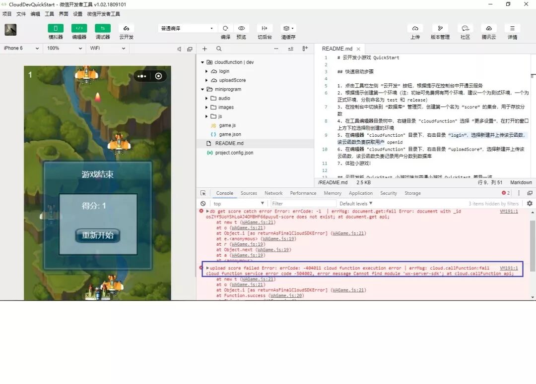 我新建云开发QuickStart项目,按照README.md中的提示进行操作,运行时云函数报错: