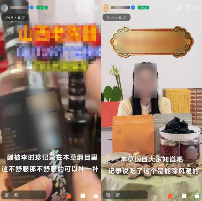 带货者利用药理书籍《本草纲目》《黄帝内经》等药理书籍的相关描述来增加用户信服度,实际是在暗示食品具有相关医疗功效。