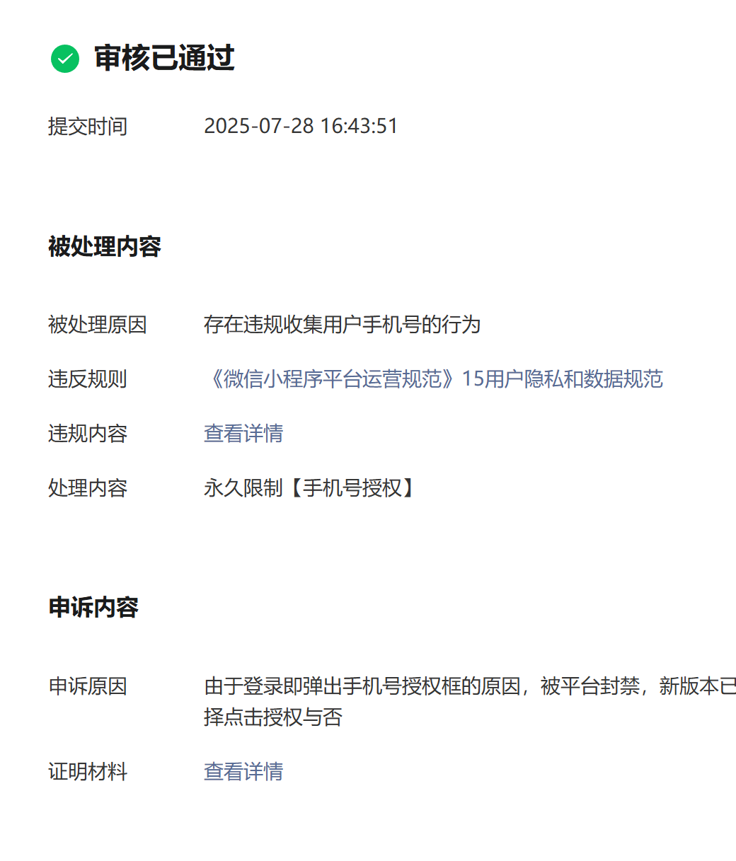 你好,请登录微信公众平台查看站内信,根据指引内容进行排查,确保最新版本审核通过且发布完成后,再发起申诉。
