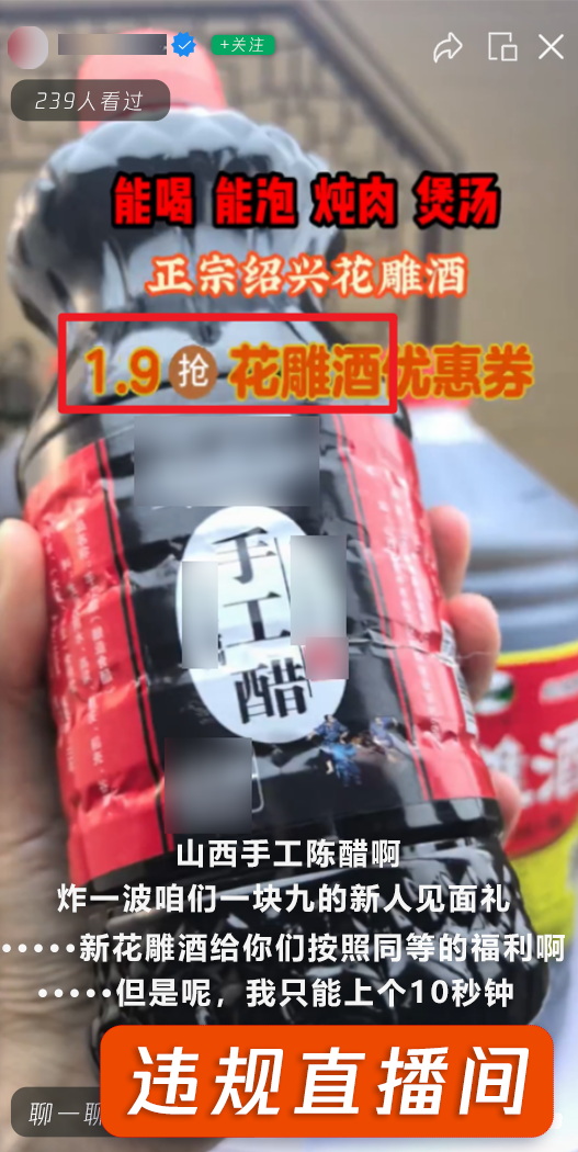带货者直播推广时,介绍陈醋作为新人福利仅售1.99元,随后介绍花雕酒时,用“同等福利”等表述模糊花雕酒价格,且直播中存在商品画面与口播商品不一致,易误导用户认为花雕酒价格也是1.99元,实际上花雕酒价格是19.9元。此行为易引起用户误解或错拍商品。