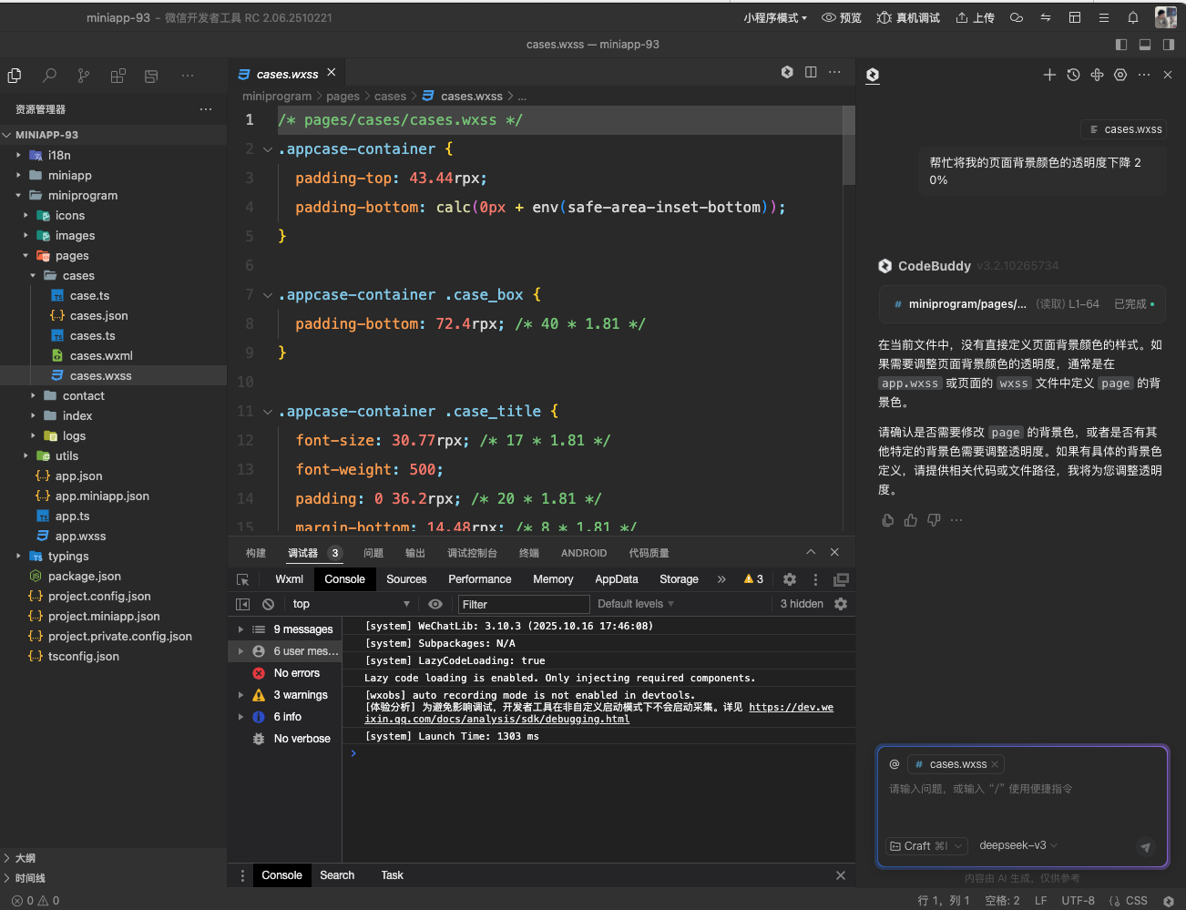 F修复局部编译下 babel / swc 文件找不到的问题F修复 wxml 代码补全缺失和快速跳转失效的问题F修复 相关安全问题F修复开启代码加固就无法预览上传 subpackage.entry 文件F修复 快捷键设置窗口样式问题F修复 packnpm 修改 packNpmRelationList 没有作用F修复 编译模式修改问题F修复请求相机未出现授权弹窗F修复多端大体积插件上传失败的问题F修复 打开项目存在没有权限文件导致模拟器加载 timeout 的问题`F修复小游戏多账号调试使用问题F修复独立分包加载失败F修复聊天工具获取成员信息无法正常展示昵称和头像F修复 canvasToTempFilePath :fail permission deniedF修复 可视化关闭再打开渲染异常问题F修复 TCP onConect 缺少 remoteInfo 等信息F修复 mac26 导致工具应用卡顿的问题F修复 跳转页面报错self.WeixinWorker.appServiceMsgHandler is not a functionF修复 无法创建小游戏插件的问题F修复 切换调试器到其他 tab 再切换回来调试器调试器状态异常F修复 部分情况打开项目不会自动编译的问题F修复清除 iOS 证书签名缓存未生效F修复 wxs 相关编译问题和 wxml tag 内字符串允许换行F修复 windows 场景部分编辑相关的菜单为空的问题F修复默认不加载调试器后进入项目点击启动调试器无法正常获取信息F修复 安卓证书管理无法选择 jks 文件的问题F修复 安卓证书管理无法选择 jks 文件的问题F修复 登录框中英文切换展示文案的问题F修复 预览小游戏插件宿主 appid 不对的问题F多端 iOS 云构建次数提示F修复 检查更新弹窗样式错乱的问题F修复 插件报错 has been used as another component or page.F修复 可视化添加组件和删除组件失败的问题F修复 设置打开项目不加载编辑器后异常问题F修复热重载报错U完善 小程序可视化适应新版本U完善 调试器加载流程和区域展示F修复插件菜单栏的初始化F修复 代码依赖分析搜索框失焦问题F修复 cli 无法使用的问题F修复 其他 项目编辑器高亮失效的问题F修复 局部编译时包含 preloadRule 预览报错的问题U优化 工具构建日志面板(多日志导致卡顿的问题)U优化工具菜单创建逻辑F修复使用「编译模式」时出现的编译失败问题U优化 项目加载骨架屏U优化工具菜单创建逻辑F修复使用「编译模式」时出现的编译失败问题U优化 项目加载骨架屏F修复小程序使用 cos 预览/上传失败的问题F修复 项目窗口切换游客模式登录没有生效F修复 体验评分页面数显示 loading 的问题F修复 http调用 “构建npm”,“预览” 失败的问题F修复代码片段插件模式没有分享入口的问题F修复 公众号网页调试分享至朋友圈弹窗错误的问题A新增 支持微信快速登录工具F修复 部分场景项目编译卡死的问题F修复 依赖分析插件面右键菜单缺少打开文件F修复了无法拖动模拟器区域大小的问题F修复 点击模拟器底部页面路径无法打开对应的文件F修复 windows 版本检查更新导致代码文件出现删除线的问题F修复 多端 Android 运行按钮无法使用的问题F修复获取鸿蒙设备失败F修复 windows 场景文件操作右键菜单给调试器挡住的问题F修复 部分场景启动黑屏的问题F修复 wxss 编译报错没有提示对应的文件F修复同时使用多个多端插件时下载失败的情况F修复 编辑器插件加载不了的问题U模拟器弹出后样式优化F修复 重新编译后 API Mock 数据被重置的问题F修复 分包 entry 被无依赖过滤的问题F修复 部分 Mac 场景安装失败提示无法打开的问题F修复 iOS构建 appex 签名错误F修复 部分语言插件高亮显示问题F修复 编辑器 diff 文件样式丢失的问题F修复 检查更新安装后编辑器的代码高亮存在问题F修复 部分场景下安装编辑器插件失败问题F修复小游戏和小程序创建显示的最近使用 appid 异常F修复 文件列表右键菜单新建 component 等功能失效问题F修复 多端iOS 云构建消息推送NES的时候找不到profile的问题F修复 模拟器弹出场景交互功能问题F修复 反馈部分交互视觉问题A新增 升级编辑器内核和整体 UI 升级A增加低功耗硬件小程序模式F修复 多账号调试 wx.login 失败的问题F修复当使用 ssss/less @import时重复上传内容的问题A配置支持多端 iOS 启动页视频F修复上传大体积多端插件进度条显示问题F修复 模拟器出现 timeout 的情况F修复大体积安卓多端插件上传类型错误的问题F修复 saveFileSync 失败F修复 webview 调试页无法正常打开F修复 chooseMessageFile 文件名含有分号无法打开的问题F修复检查更新弹窗无响应F修复 skyline 项目渲染异常问题A新增 小游戏 iOS 场景真机调试能力F修复 自动化测试无法录制的问题U优化 下载已废弃基础库错误提示U优化 下载已废弃基础库错误提示F修复骨架屏无法生成的问题A更新城市选择器数据F修复 点击底部栏会呼起隐藏的主窗口F修复 wx.getStorageSync 获取不到值的问题F修复 智能创建项目反馈问题F修复 游客态小程序渲染异常的问题F修复 工具清理缓存文件失败的问题F修复 清除缓存后 wx.loadFontFace 报错问题F修复 网络请求丢失同名 header 设置导致的问题U支持上传体积较大的多端原生插件F修复 使用插件报错Framework TypeError: LifeCycle.start fail: Cannot read property 'split' of undefinedF修复 FileSystemManager.mkdir 设置recursive不生效F修复 插件本地开发预览报plugins 缺少开发 xxx 插件的配置F修复 mesureTextString 获得的宽度不精确F修复 登陆相关反馈问题F修复 反馈启动项目窗口白屏的问题F修复 退出模拟器页面可能导致工具 crash 的问题F修复