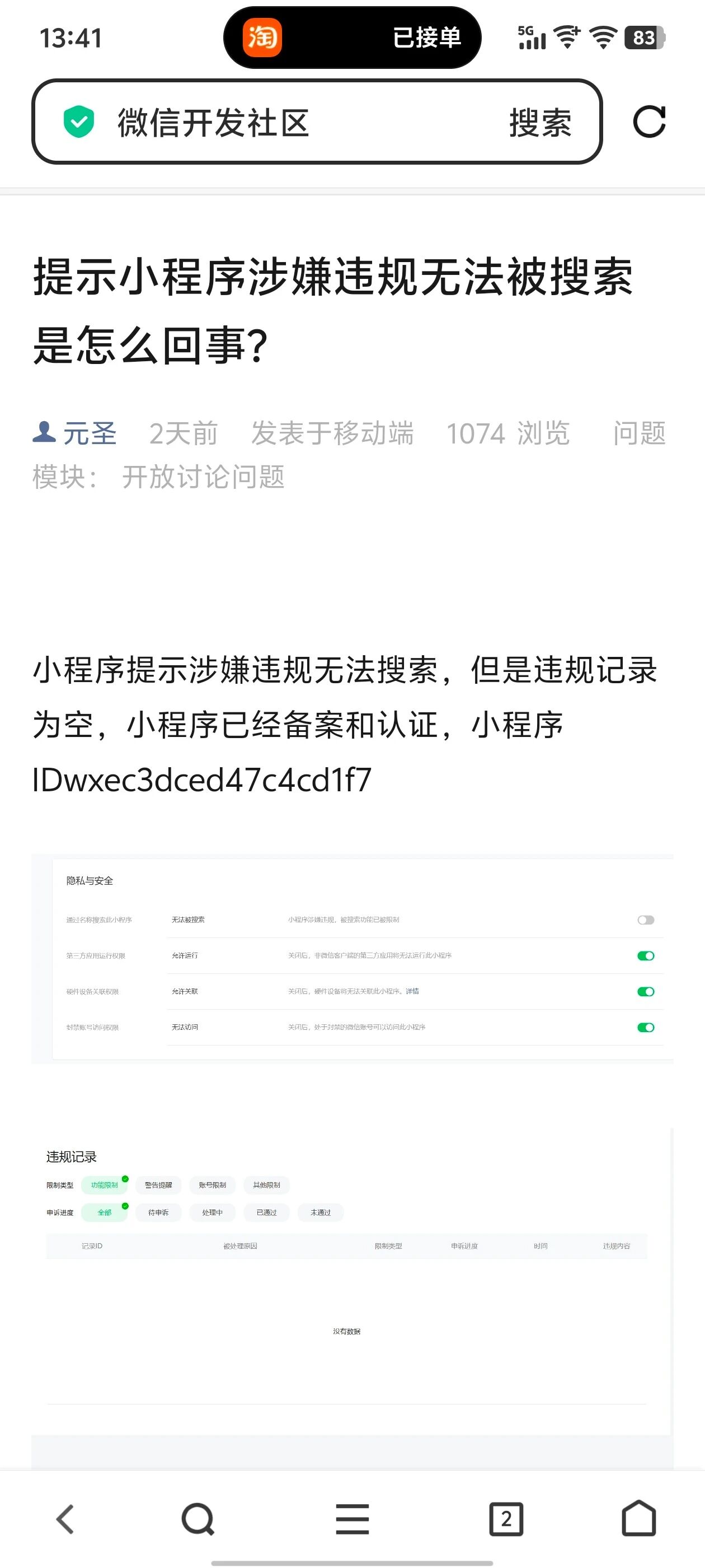 上次发帖子了但是没有人知道怎么回事,小程序提示涉嫌违规无法搜索,但是违规记录为空,小程序已经备案和认证,小程序IDwxec3dced47c4cd1f7