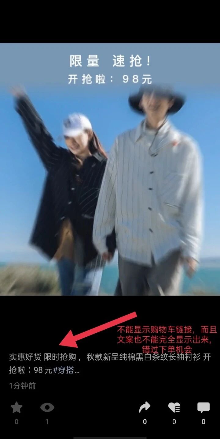 发布视频后,文案只能显示一行字,而且最重要的购物车链接显示不了,只能点击一下文案,然后才会单独显示购物车链接才能显示在评论区里,严重影响顾客购物,很多人都是不点文案的,错过了下单机会