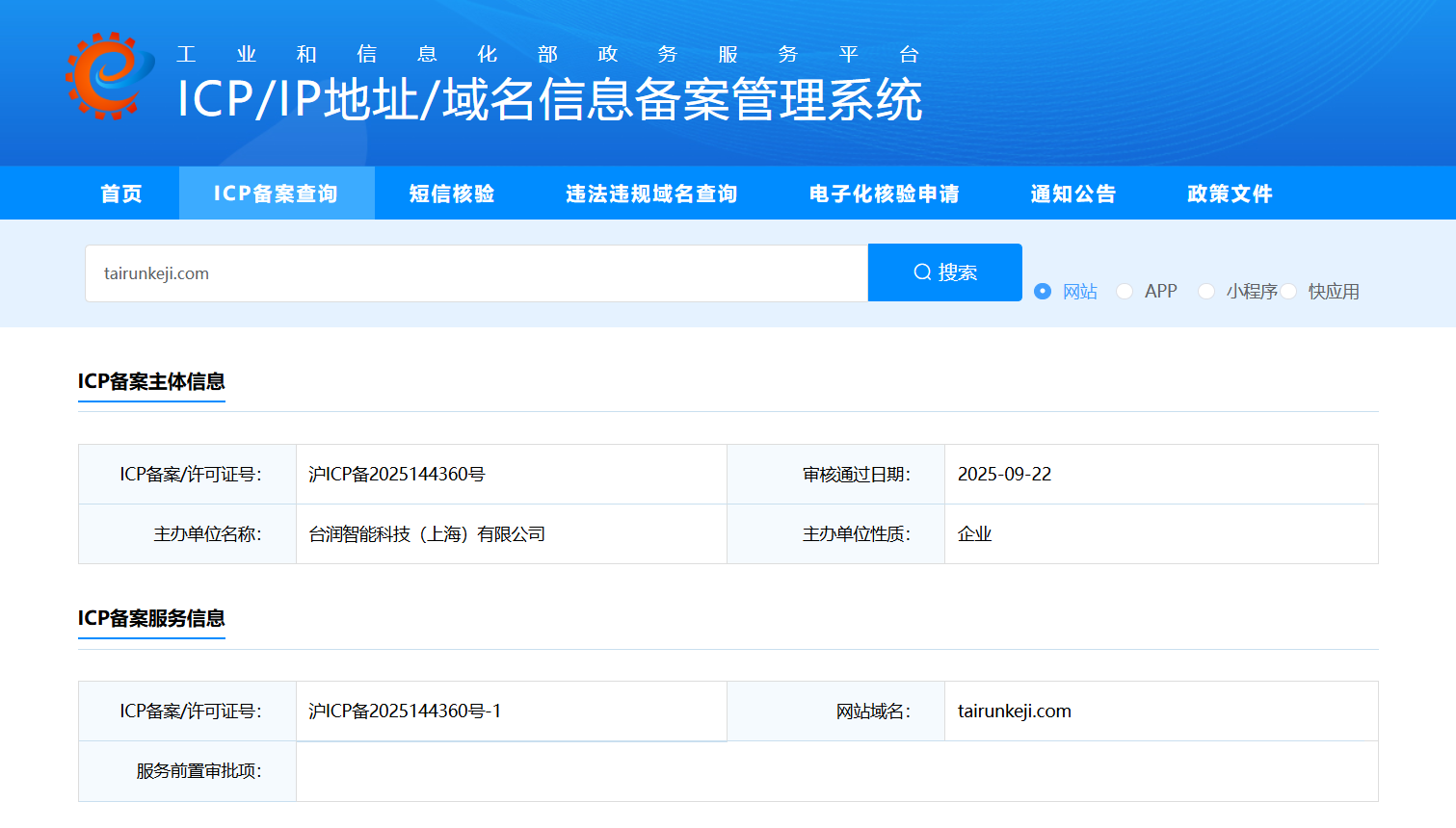 www.tairunkeji.com 台润智能科技(上海)有限公司,域名是9月份刚新注册的,网站就是普通的企业官网展示产品为主, 并且域名有开了SSL安全认证及ICP备案(沪ICP备2025144360号-1),请求解封。