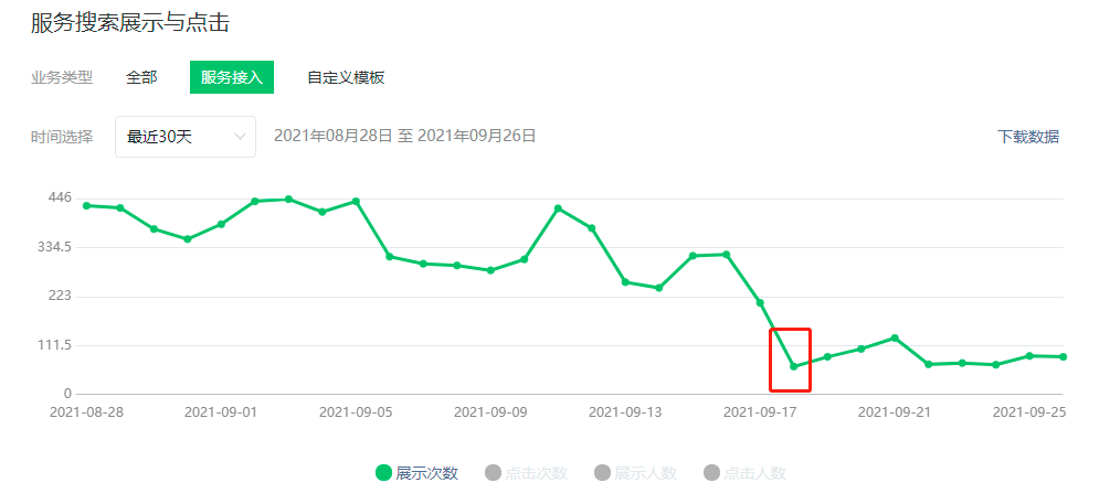 服务搜索展示次数在9月18号突然下降,如图所示,服务在相关搜索关键词下的排名和关键词的微信指数都正常,请问是怎么回事呀?@官方