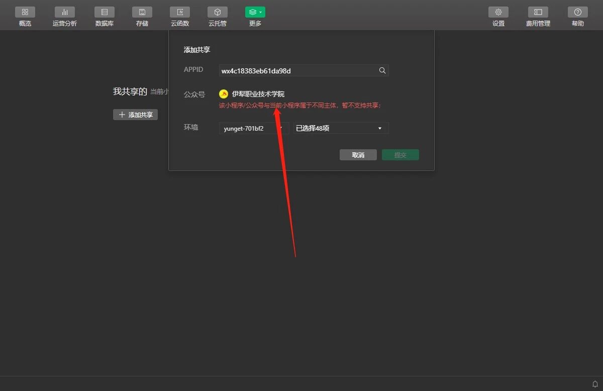 同一个主体的小程序云开发环境共享同一个主体的公众号就不行,一直提示不是一个主体的,但是明明是一个主体的,这个是什么问题