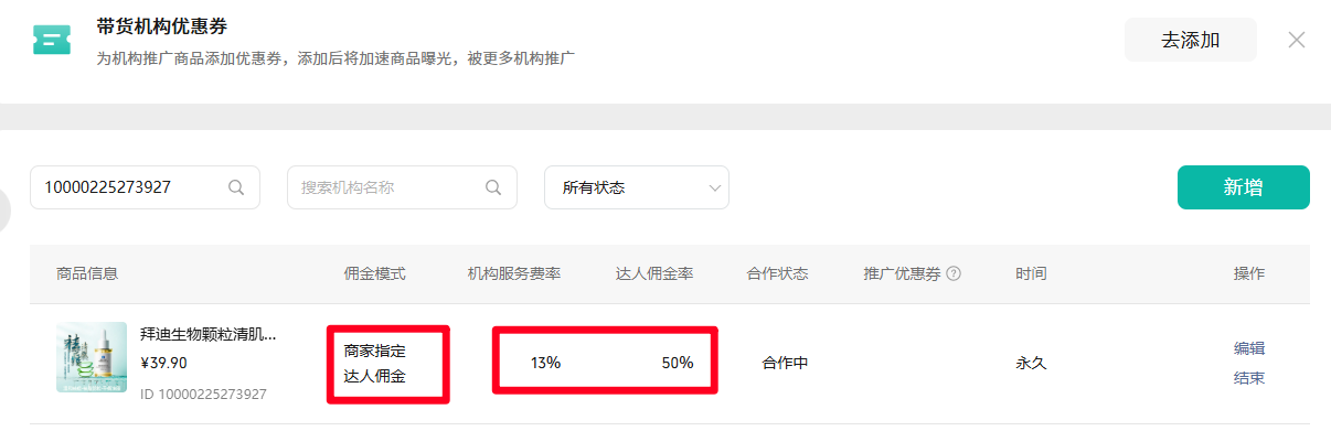商家设置这个商品的是商家指代达人佣金,达人佣金比例是50%,机构服务费率是13%