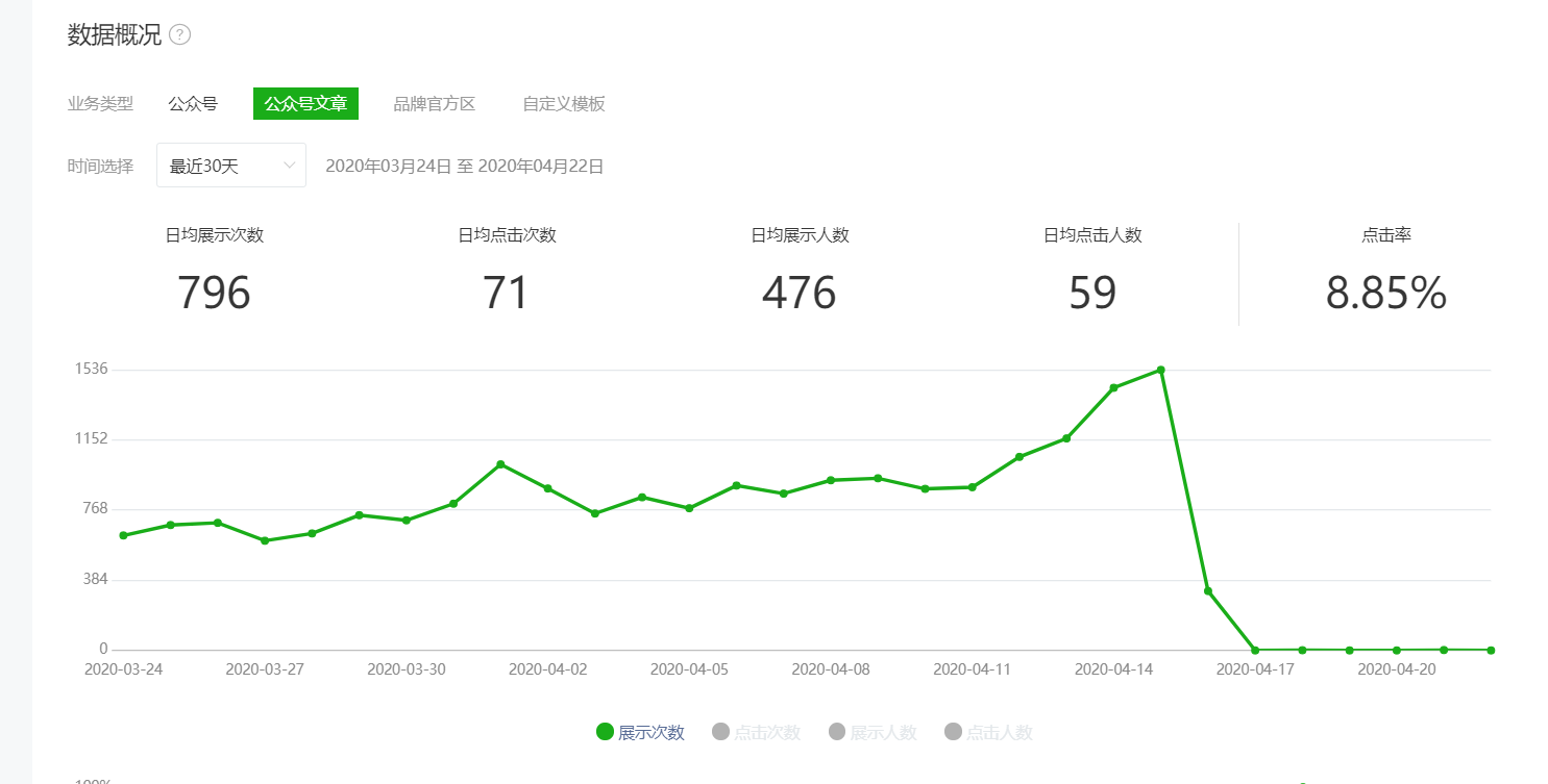 在4.15日之前,我的公众号文章每天可在搜一搜展现数百次,带来的阅读量从几十个逐渐增长至100+,4月16日忽然骤降,4.17日降为0