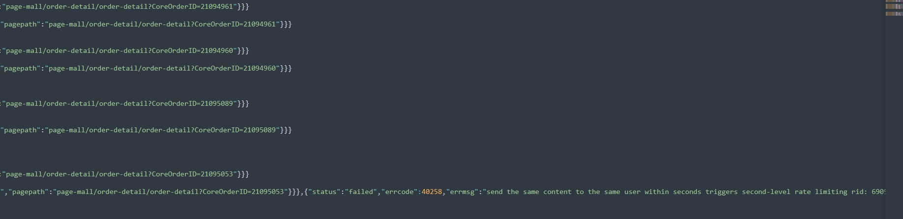 40258 send the same content to the same user within seconds triggers second-level rate limiting 服务器给同一用户发送相同内容触发秒级频控