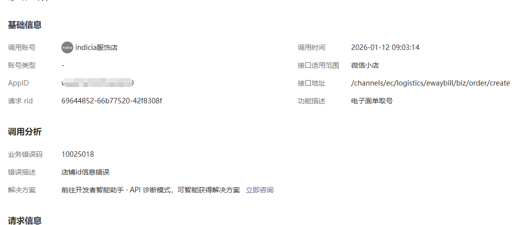 电子面单取号时,返回"店铺ID错误,请检查shop_id",
