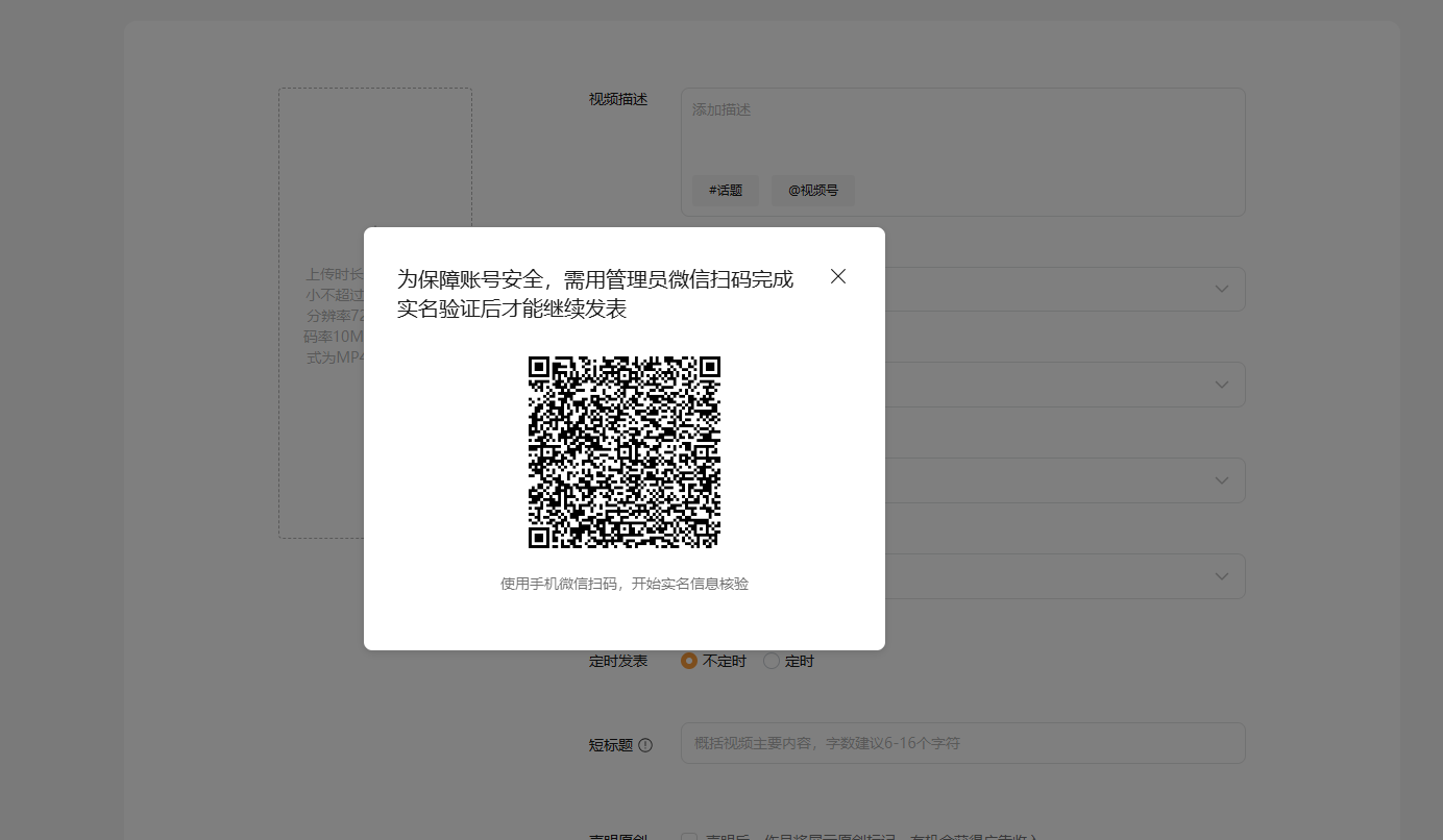 从10月下旬开始视频号助手每次发布视频都要管理员扫码实名?之前从未出现过,我账号本身就是运营者的,每次发布视频的时候都需要管理员扫码,这是怎么个情况,之前从未出现过,希望官方给予一个肯定的答复,是不是你们搞什么措施了,或者又开始出现什么规则了。关键不只有一个账号这种情况,所有的账号都出现了这种情况,如果你们不解决的情况下,那还要运营者干什么??
