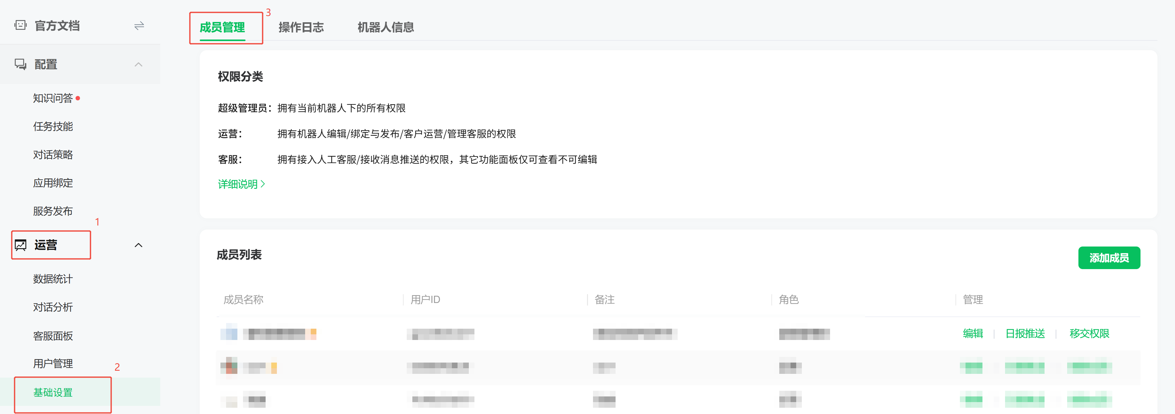 您好 在【运营】-【基础设置】-【成员管理】处添加权限。