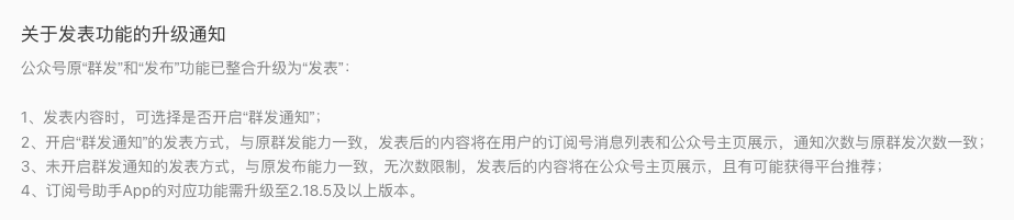 公众号后台“发布”和“群发”按钮合并到「发表」按钮里面了。