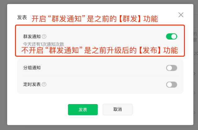 以前有个发布功能和群发功能,现在怎么只有发表这个功能啦?以前的发布可以先发给领导审核,不占群发功能的次数,请问这个功能怎么恢复?