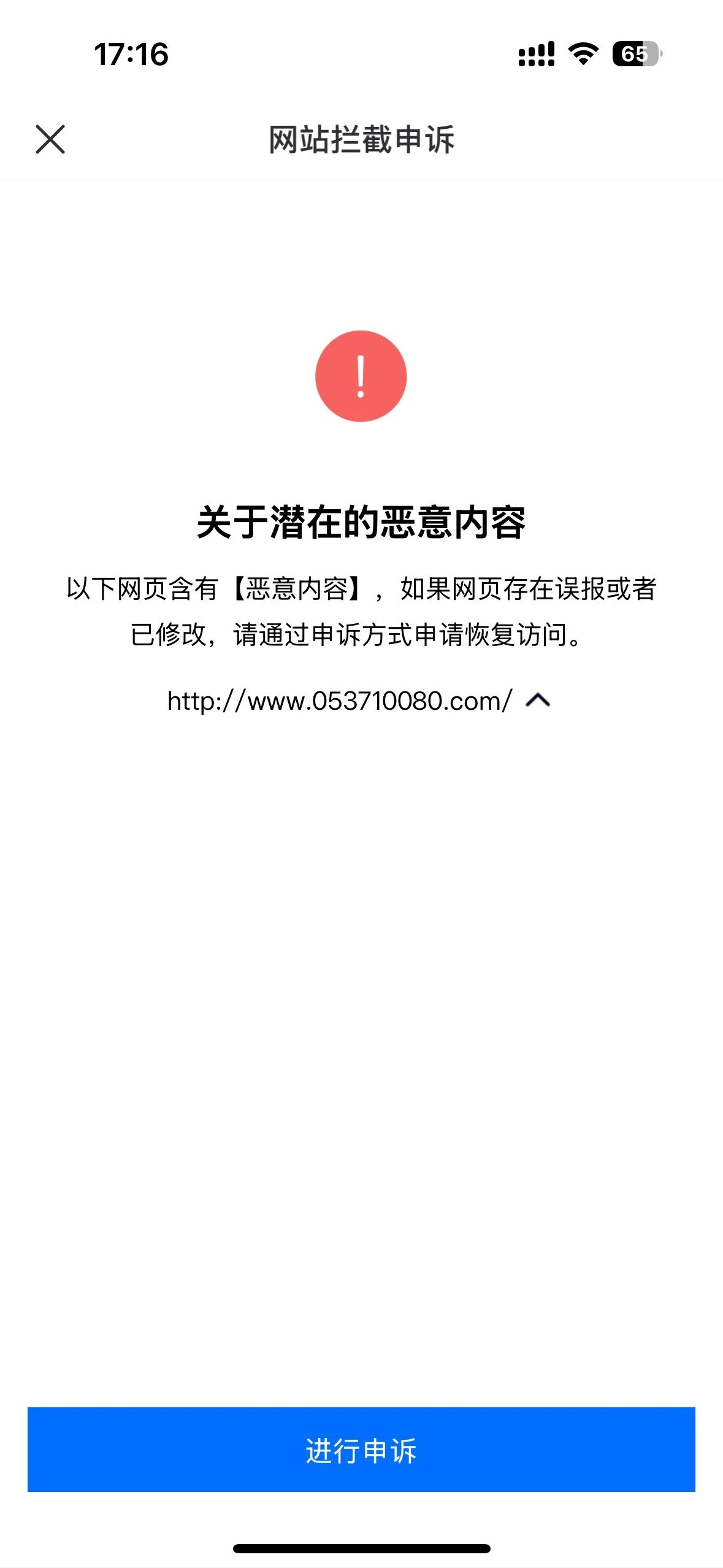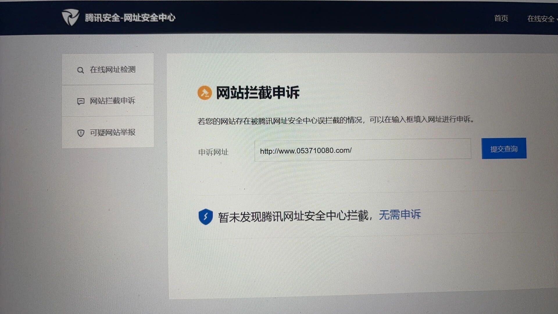 站点:www.053710080.com 已通过国家工信部备案要求,在腾讯网址安全中心没有发现拦截,请领导协助解除风险提醒,感谢!