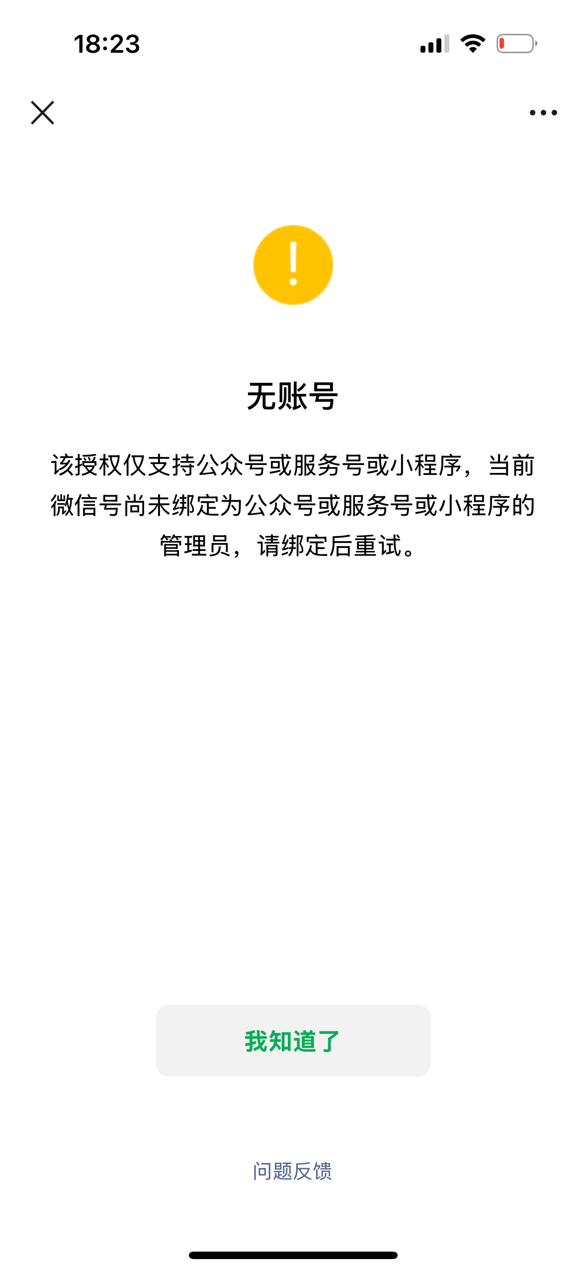 你好,请参考 https://developers.weixin.qq.com/doc/oplatform/Third-party_Platforms/2.0/troubleshooting/authorization_troubleshooting.html#%E4%BA%94%E3%80%81%E5%95%86%E5%AE%B6%E6%8E%88%E6%9D%83%E6%8F%90%E7%A4%BA%E6%97%A0%E6%B3%95%E6%8E%88%E6%9D%83%E3%80%81%E6%97%A0%E8%B4%A6%E5%8F%B7 自助排查