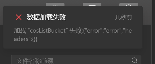 点击储存按钮之后会长时间加载,最后报错,内容是“数据加载失败 加载"cosListBucket"失败:{"error":"error","headers":{}}”。