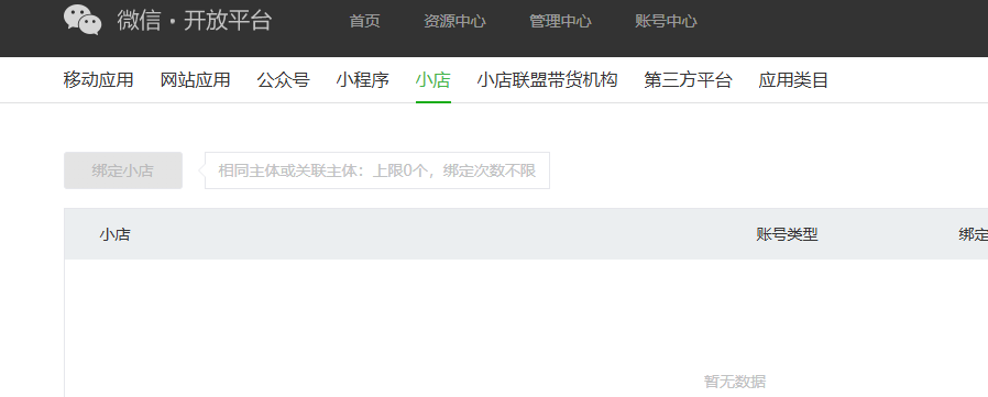 微信开放平台的这个地方“小店”的“绑定小店”我看无任何提示,小程序、公众号等其他几个鼠标放上去之后提示未认证无法进行相关操作,而小店没有,是不是认证了目前也无法绑定小店还是需要认证了之后才能进行小店的绑定呢?