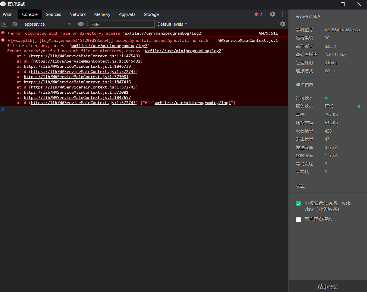 [wxapplib]] [LogManagerwxe5345f299d98aeb4]] accessSync fail accessSync:fail no such file or directory, access 'wxfile://usr/miniprogramLog/log2'