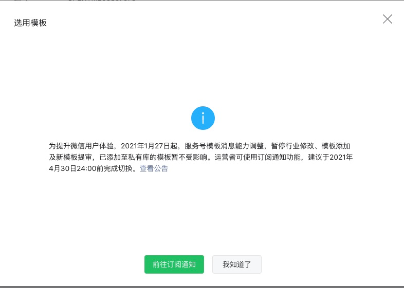 服务号订阅通知灰度测试期自2021年1月27日0:00至4月30日24:00,期间服务号模板消息可正常使用;灰度测试期结束后服务号订阅通知的策略将另行公布,届时以官方信息为准。