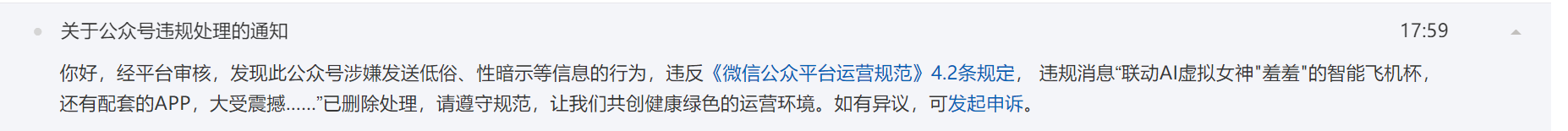上面文字根本不涉及任何的色情低俗文字,其它的公众号大号发布同样的内容,居然我投诉了也不违规,我申诉也没通过,官方能不能再审核一下啊,感觉就是机器人审核。