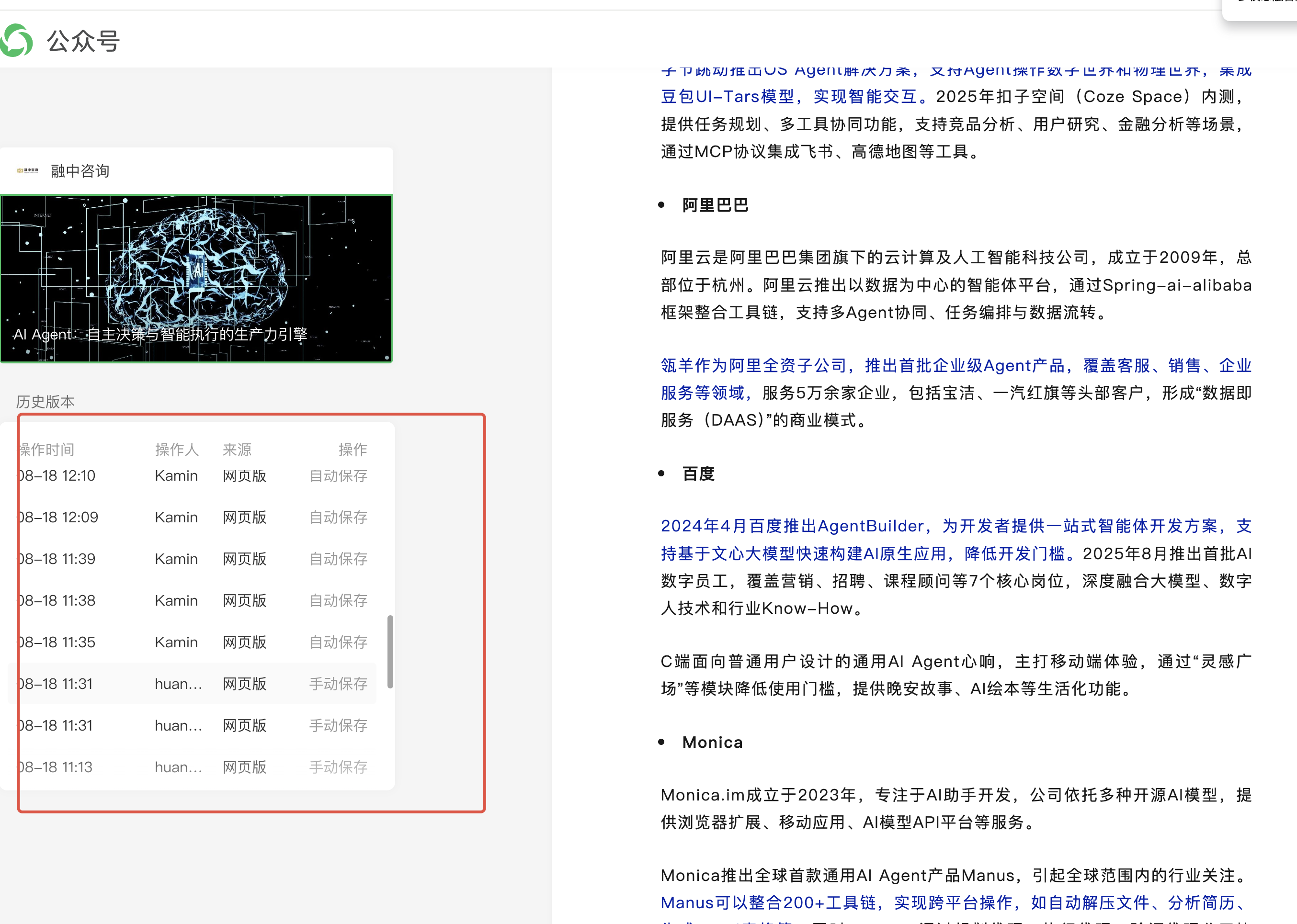 融中咨询公众号草稿《AI Agent:从被动响应到自主行动的技术升维》8月17日-8月18日11:30修改多次且保存,8月18日11:30后另一名编辑人员再次进入编辑,草稿内容全部变为8月17日前的那一版本,亟需8月18日11:30之前的最后一版草稿,急急急!!!需要如下图的那一版