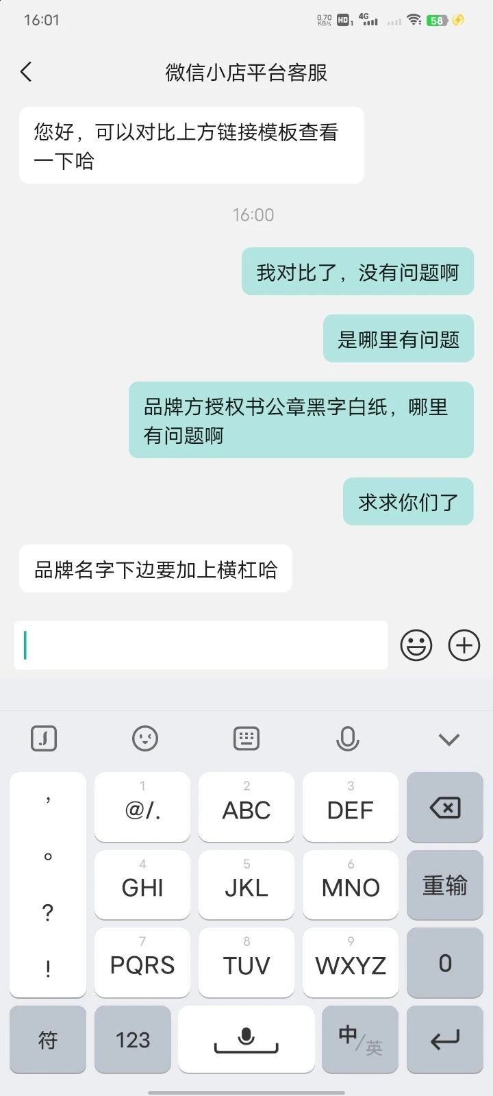 品牌授权审核不过,没想到是因为品牌授权书少一横杆,无力吐槽。白纸黑字公章盖齐,就缺一横杆,真的无力吐槽。而且联系两次客服,还让我修改两次还是不通过。心态炸裂了