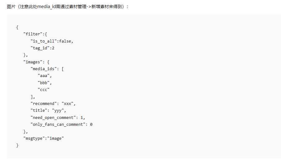 请求的参数:{"filter":{"is_to_all":true},"images":{"media_ids":["MeSeYGUxa3v8cVEDz_4m3F901NOnxQRT9fXrA5EGPwdpGrzh-27JObQua1j0xMRX","MeSeYGUxa3v8cVEDz_4m3D9RoVJH4n2Iq1XvU-EDe62e-Y3fgR-mB2n18jn9ctAG","MeSeYGUxa3v8cVEDz_4m3Mcv7Jl7zrz2kvwwJGQW2M_pVW9p6SIZhzYaZoG5SRS7","MeSeYGUxa3v8cVEDz_4m3J0ZvSMMcZpiPSZJz4nCMcNjUG4K5PZd632S0bUzv8nm","MeSeYGUxa3v8cVEDz_4m3IeysYBb5O7bFYvXZ5nDcf3URTSE0BEIJTyp1iXL7UVi"]},"send_ignore_reprint":0,"recommend":"","title":"行进中国行-demo","msgtype":"image"}