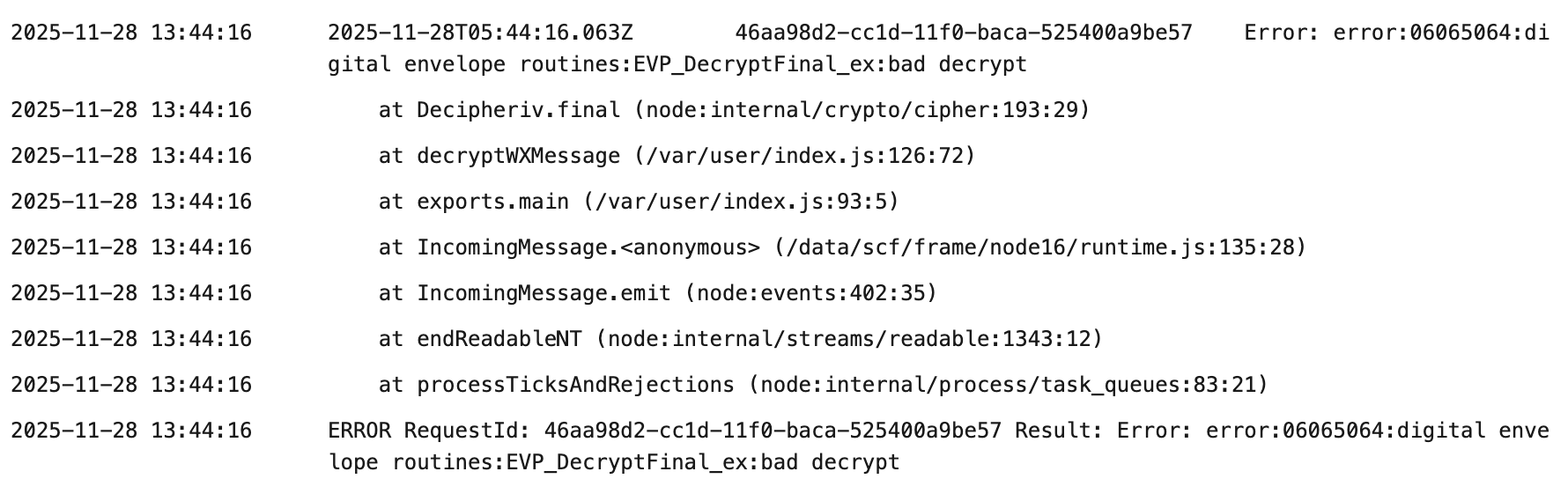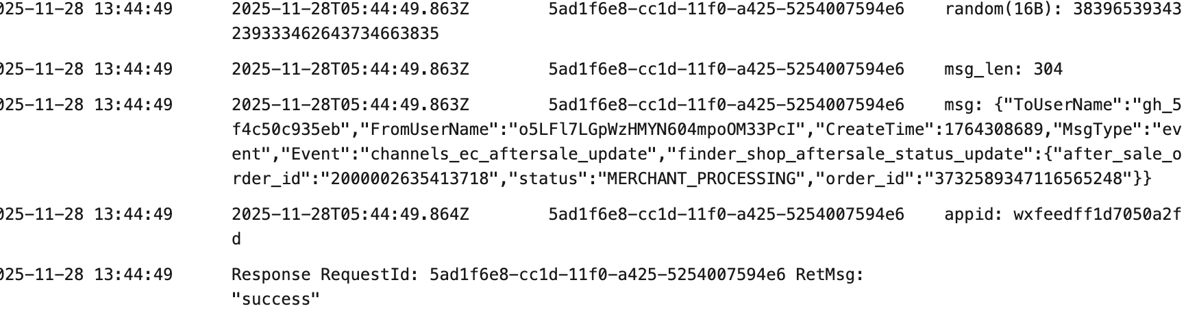 我使用云函数订阅了微信小店的事件消息,现在我在测试订单的相关消息,但是发现接收到的消息有的能解密,有的就解密失败。