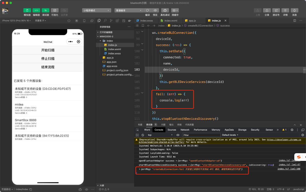 我想直接在开发者工具上调试蓝牙,但是我在MacOS系统使用开发者工具调试蓝牙时报错。如图。
