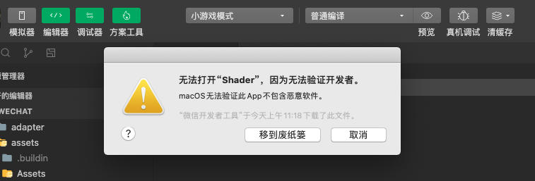 解决方法,在微信开发工具系统目录下找到 Shader 文件,右键打开并允许运行,或者命令行忽略整个文件夹权限检查