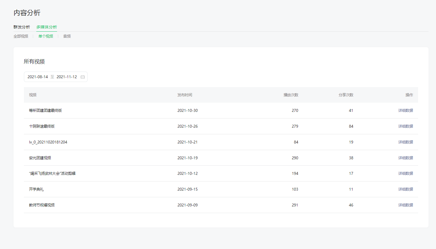 现在就是进入后台,点击内容分析,点多媒体分析,点单个视频,然后十一月份的所有视频数据都不显示