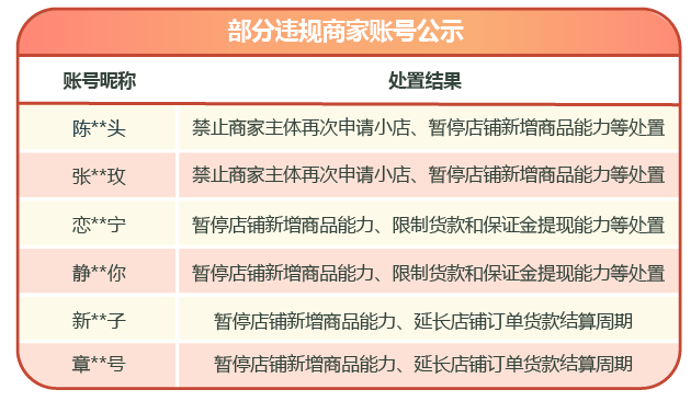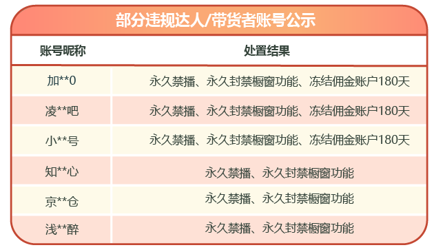 以下是近一周被处置的部分情节严重的商家、带货者名单: