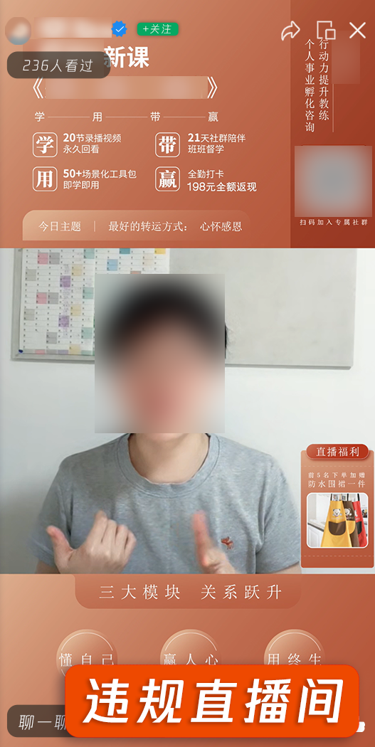 带货者在直播推广某课程类商品时,画面展示群聊二维码,引导用户扫码进入群聊,有意使用户脱离官方平台进行私下交易或建联。此类行为可能给用户带来不确定的财产安全风险。