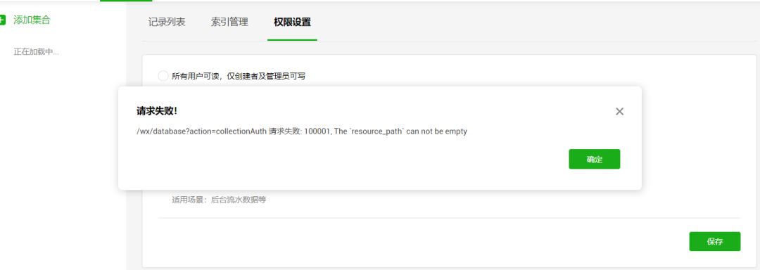 我的后来显示这个错误:/wx/database?action=collectionAuth 请求失败: 100001, The `resource_path` can not be empty