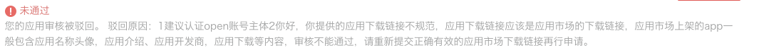 创建移动应用,审核不通过,提示需对open账号进行主体认证。只是想实现分享功能,这个也需要进行主体认证吗?还有就是说我提供的应用市场下载链接不规范,我这个是苹果商店的下载链接地址,如果这个还不规范,那请问规范的下载链接地址是什么样的,麻烦发个实例看下?