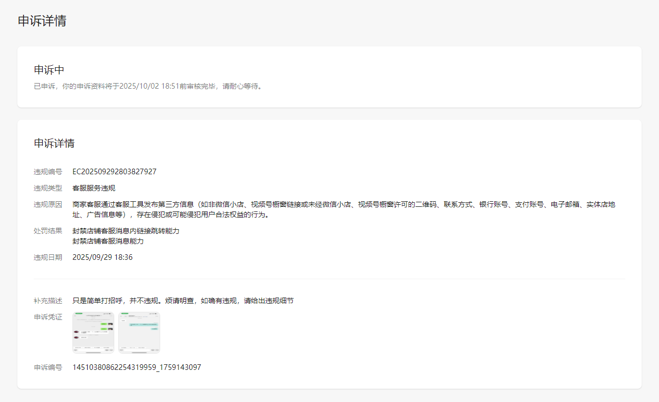 刚注册的微信小店,为了测试第三方客服接入,发了你好,直接被封禁了,违规原因是因为发布了未经许可的第三方信息,请问这个对话到底哪里违规了?