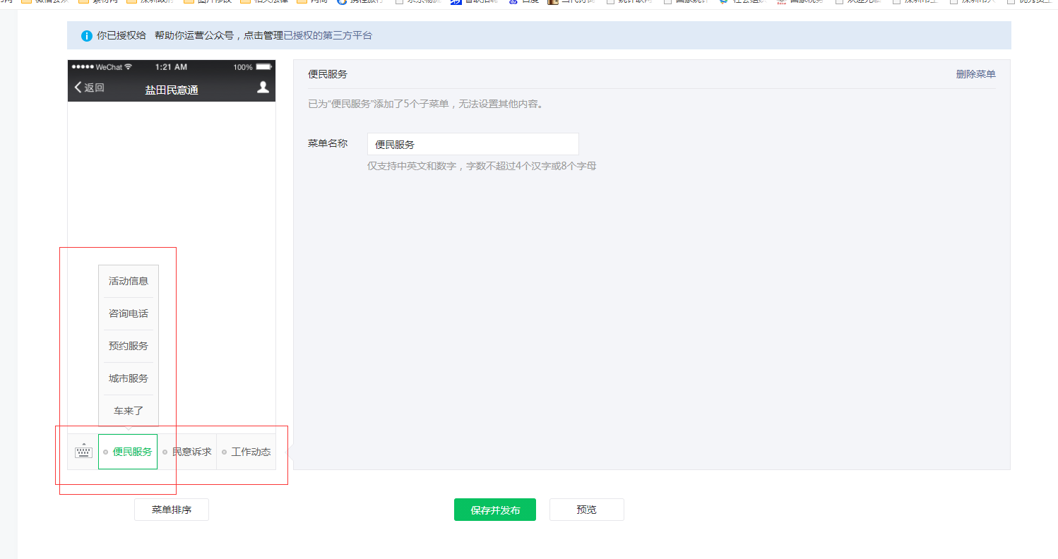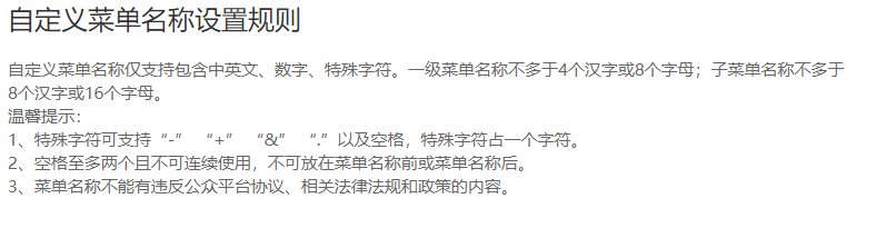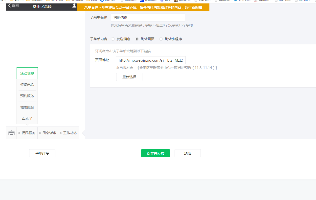 您好,这是我们公众平台发布在子菜单上所遇到的状况,以前包括上一周发布时并未遇到这种情况,我们发布的文字和图片除了日期不一样,并无不同,但是这周无法发布,提示“菜单名称违反公众平台协议......”。试过多次更改无果,这个公众号是政府部门用来发布信息,还请告知需要怎么更改才可以发布?非常感谢!