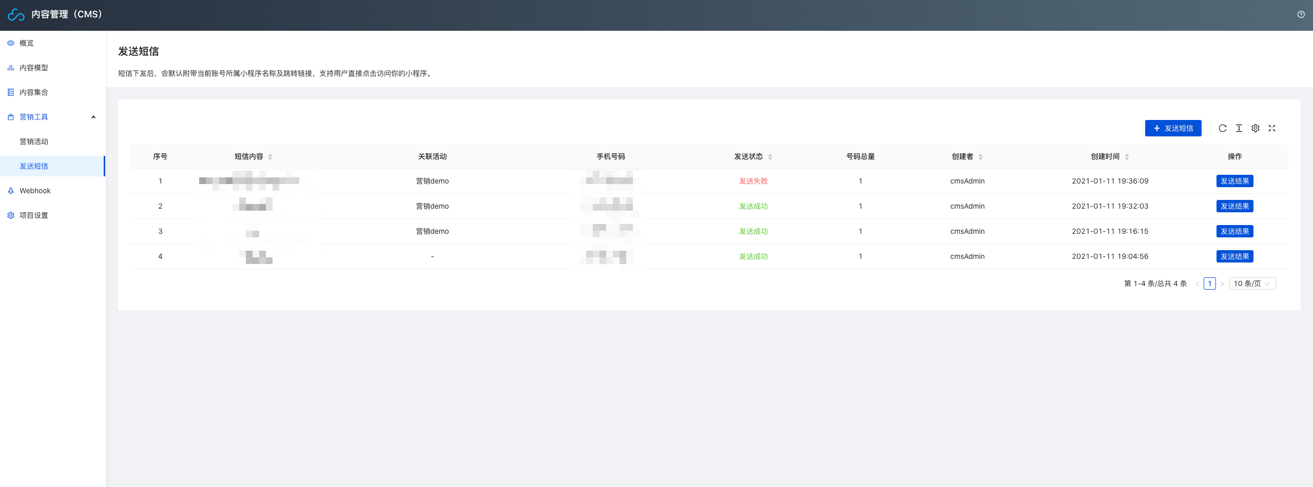 另外开发者也可以通过小程序云开发的拓展插件 内容管理 创建营销活动,开通营销工具,完成短信发送(需将内容管理升级为最新版本2.6.8)。