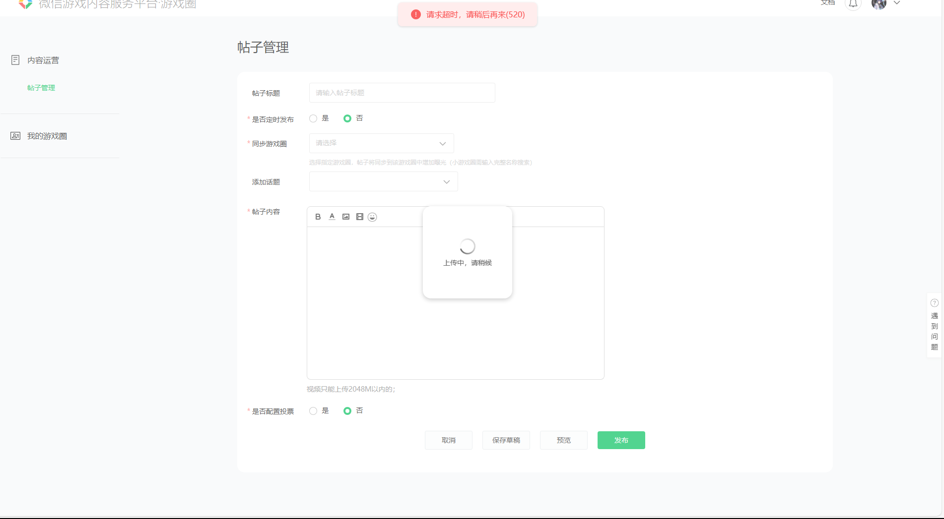 过段时间再刷新页面试试,也可以检查一下视频大小(只能2048M以内)。