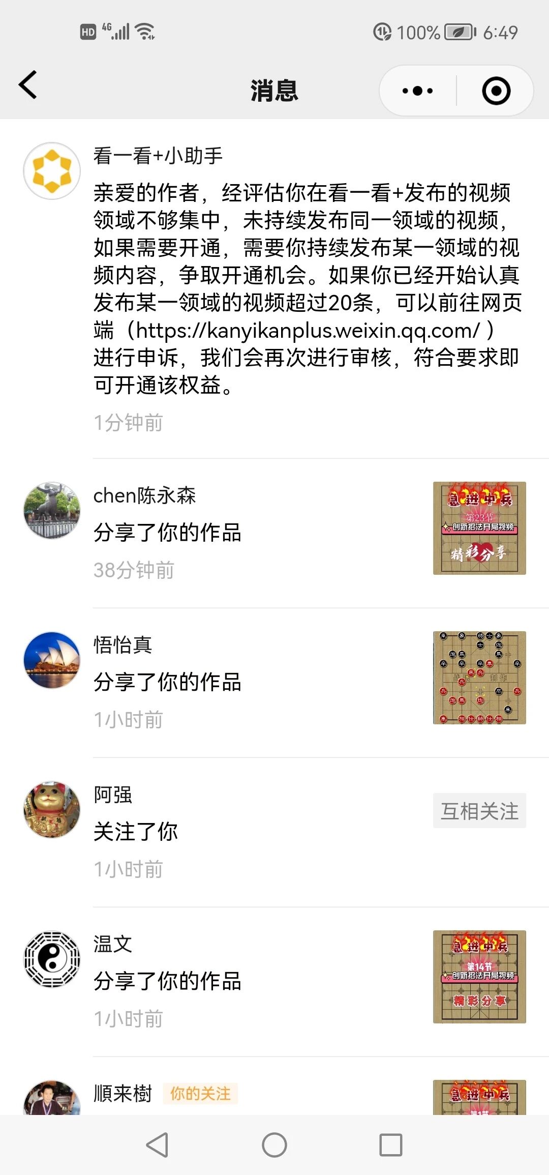 你好客服我是制作象棋视频教程的,我的微信小程序《看一看+》垂直视频和粉丝数已经达到要求了但是垂直账号认证和粉丝数达到100可以跳转公众号链接能力审核和创作者收益都审核不通过,请官方帮我解决下谢谢。