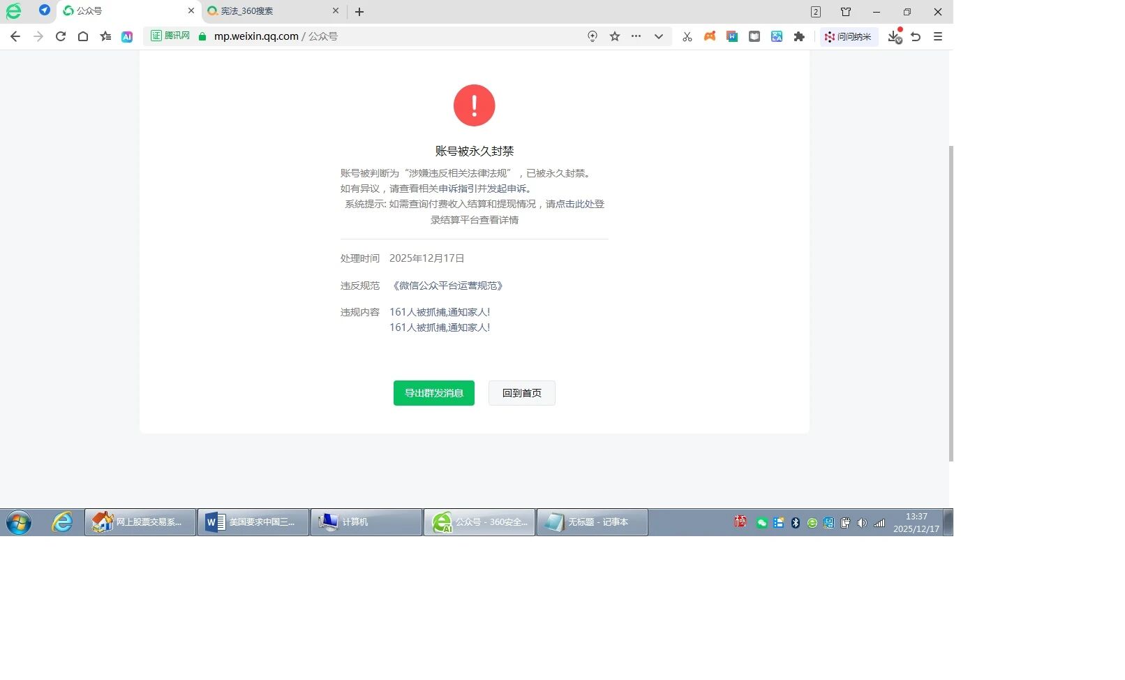 今天公众号被永久封号,理由是违反规范《微信公众平台运营规范》,违规内容是:161人被抓捕,通知家人!