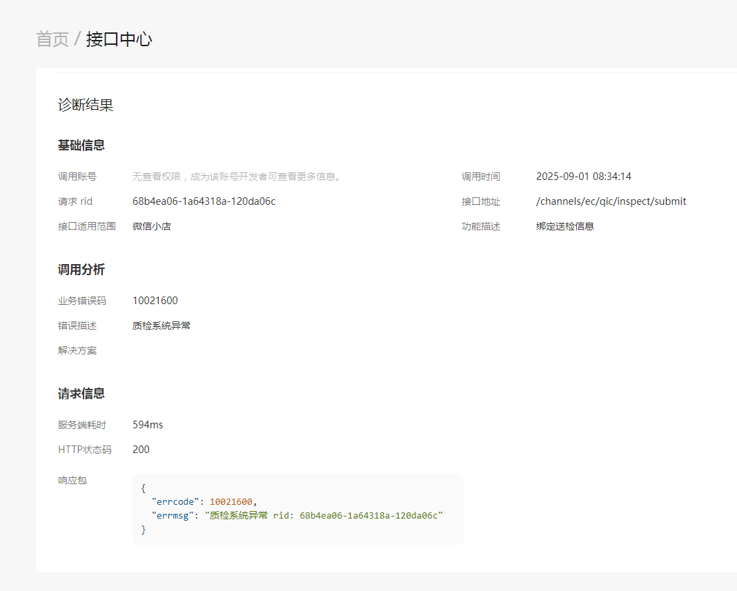 返回 {"errcode":10021600,"errmsg":"质检系统异常 rid: 68b4ea06-1a64318a-120da06c"}