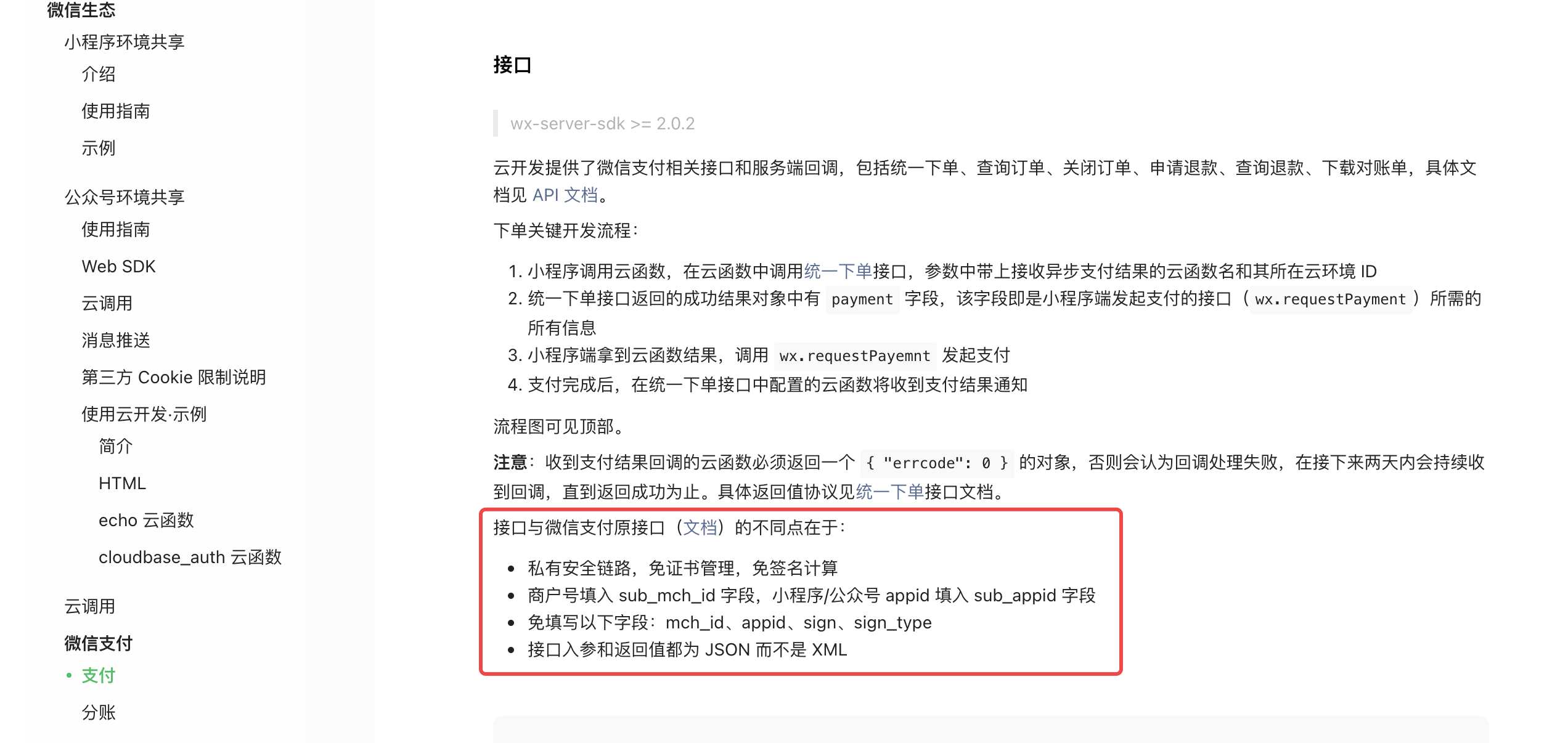 4.如果把云开发支付理解为一个微信支付服务商,逻辑上sub_mchid传了的话sub_appid和sub_openid是必传的啊,如果CloudPay.unifiedOrder()在这里做了相关处理,是不是没有考虑跨环境共享的情况,导致上述1的报错?