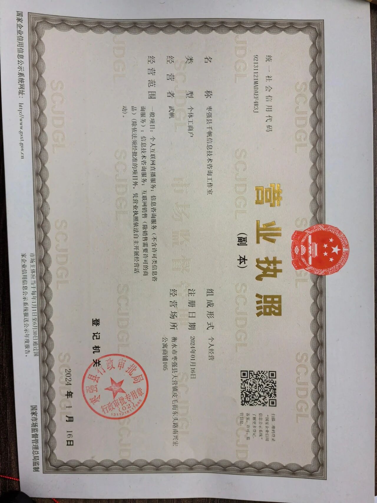 企业名称 枣强县千帆信息技术咨询工作室 信用代码 92131121MADAEF4R3J