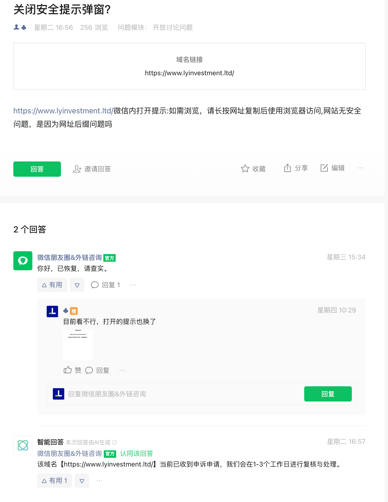 微信无法直接打开,还是提示,是因为网址后缀的问题吗?上次申诉说处理好了结果还是不行,最后也没人回复了