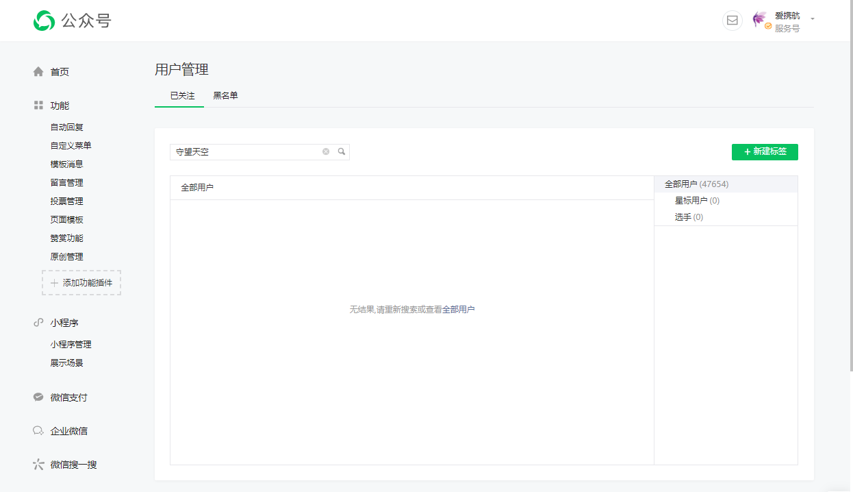 你好,是在公众号后台用户管理搜索不出用户吗?请提供下公众号名称,搜索用户名称,相关截图,这边好定位问题。