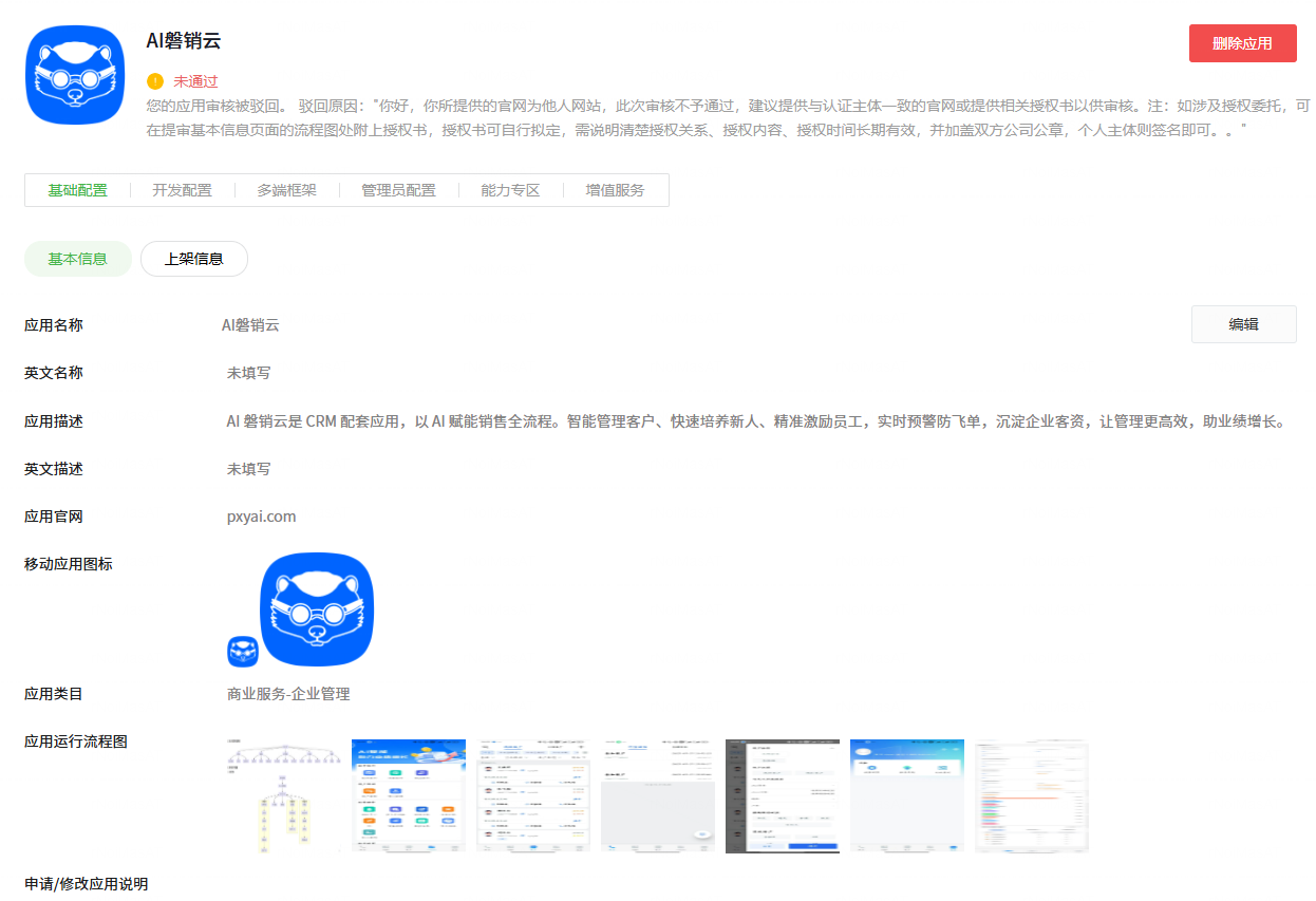 我司正在申请移动应用入驻(应用名称:AI磐销云),但审核被驳回,驳回原因显示:“你好,你所提供的官网为他人网站,此次审核不予通过,建议提供与认证主体一致的官网或提供相关授权书以供审核。”