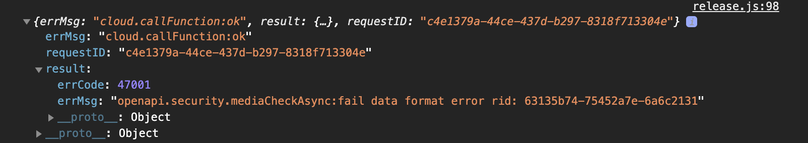 小程序调图片安全检测,发现违规图片都能通过,控制台返回ERRCODE47001,请问是什么原因,应该怎么修改呢?